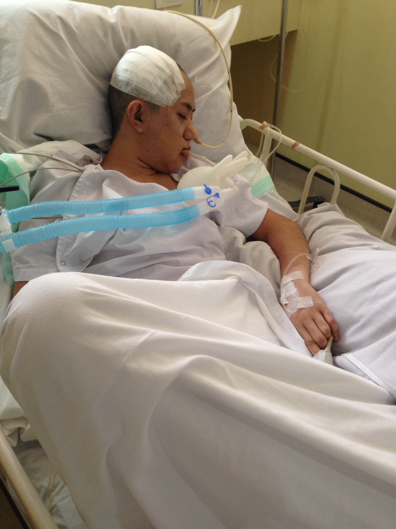 Normally, arteries carry blood containing oxygen from the heart to the brain, and veins carry blood with less oxygen away from the brain and back to the heart. When an arteriovenous malformation (AVM) occurs, a tangle of blood vessels in the brain or on its surface bypasses normal brain tissue and directly diverts blood from the arteries to the veins. Brain AVMs are usually congenital, meaning someone is born with one. But they’re usually not hereditary. People probably don’t inherit an AVM from their parents, and they probably won’t pass one on to their children. This occurs in about 1% of the population, or about 1 in 500 people. I know, right? and that one happened to be me. That is the reason why I have all the time to waste now writing this blog. Don’t get me wrong, I’m way past the angry stage or the denial stage. I have already come to accept my situation and I’m now trying my hardest to cope and improve my situation. I have attached a picture of me post-craniotomy while I was in the ICU so you could picture how bad it was. I hope you are not eating lest your appetite be ruined..