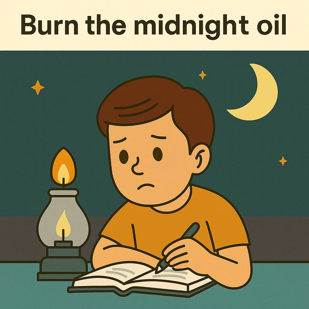 “She burned the midnight oil finishing her essay the night before the deadline.”