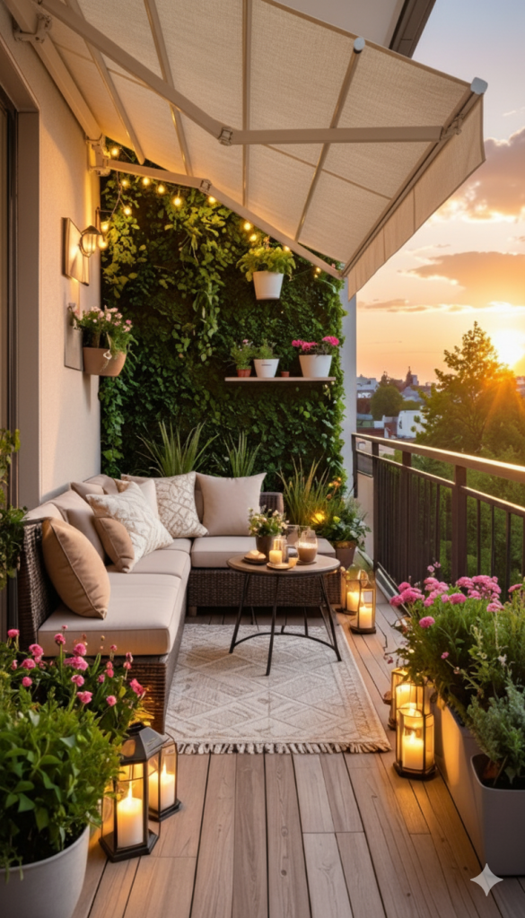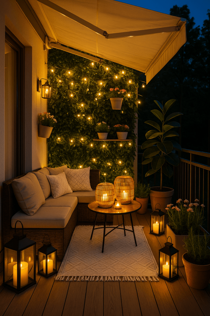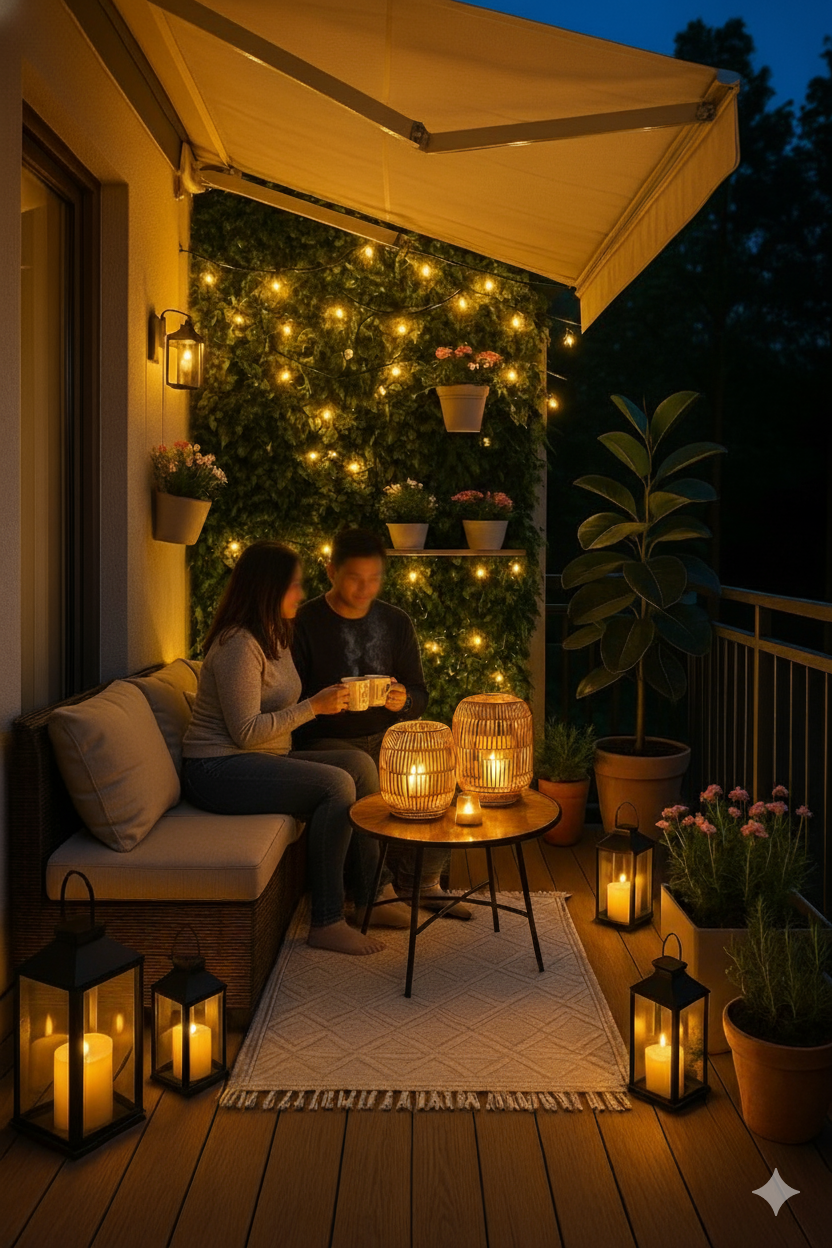 Our terrace gets plenty of sunlight during the day, so I want it to feel magical once evening sets in. My plan is to hang warm string lights across the canopy and place a few solar lanterns in the corners for that soft golden glow. Maybe even a couple of rattan lamps to match the furniture and keep the vibe natural.