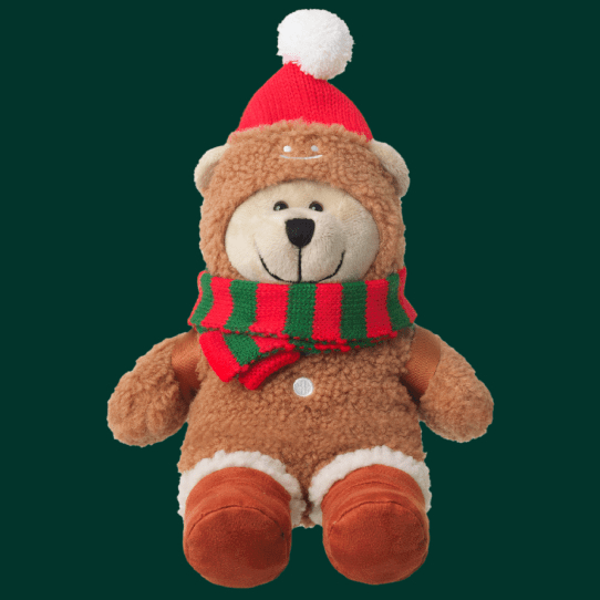 This little Bearista looks like it jumped straight out of a Christmas cookie tin. Dressed in a soft, gingerbread-inspired suit with fluffy trim, a bright red beanie, and a classic green-and-red scarf, it’s impossible not to smile when you see it. It has that “instant holiday cheer” vibe — the kind of plush you place on a shelf and suddenly the whole room feels merrier.